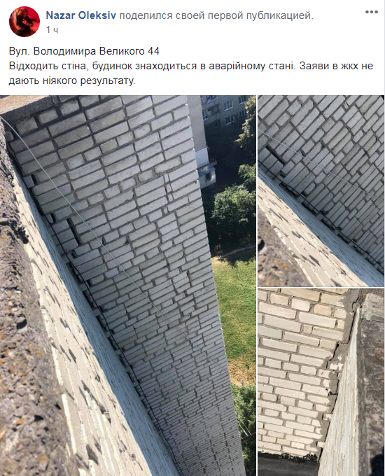 “Вул. Володимира Великого, 44.  Відходить стіна, будинок знаходиться в аварійному стані. Заяви в ЖКХ не дають ніякого результату”,- зазначається у зверненні на “Гарячу лінію міста Львова” у ФБ, де оприлюднено світлини з місця події.