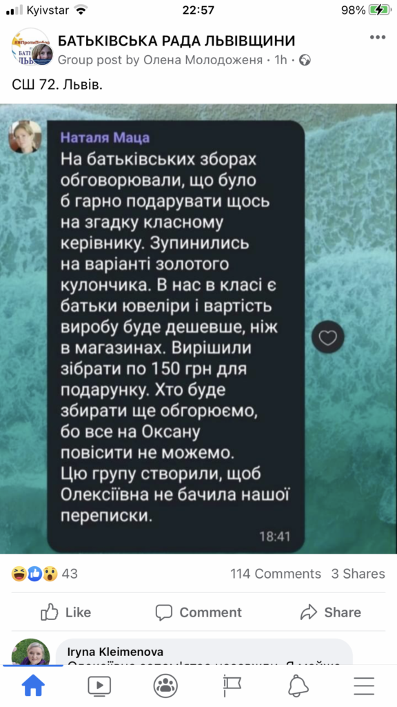 “На батьківських зборах обговорювали, що було б гарно подарувати щось на згадку класному керівнику. Зупинились на варіанті золотого кулончика. Вирішили зібрати по 150 гривень для подарунку”, – йдеться у повідомленні.