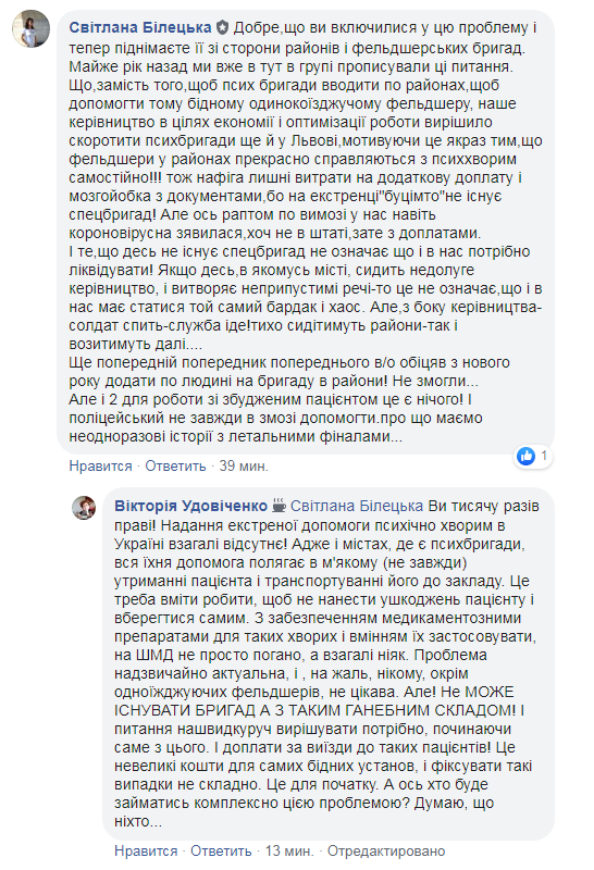 Як зазначається у дописі Світлани Білецької, “замість того, щоб психбригади вводити по районах, щоб допомогти тому бідному одинокоїзджучому фельдшеру, наше керівництво в цілях економії і оптимізації роботи вирішило скоротити психбригади ще й у Львові, мотивуючи це якраз тим,що фельдшери у районах прекрасно справляються з психхворим самостійно! Тож нафіга лишні витрати на додаткову доплату і моз… ка з документами,бо на екстренці “буцімто” не існує спецбригад! Але ось раптом по вимозі у нас навіть короновірусна з’явилась, хоч не в штаті,зате з доплатами. І те, що десь не існує спецбригад не означає, що і в нас потрібно ліквідувати! Якщо десь, в якомусь місті, сидить недолуге керівництво, і витворяє неприпустимі речі – то це не означає, що і в нас має статися той самий бардак і хаос. Але, з боку керівництва – солдат спить – служба іде! Тихо сидітимуть райони – так і возитимуть далі…. Ще попередній попередник попереднього в/о обіцяв з нового року додати по людині на бригаду в райони! Не змогли… Але і двоє для роботи зі збудженим пацієнтом це є нічого! І поліцейський не завжди в змозі допомогти. Про що маємо неодноразові історії з летальними фіналами...”