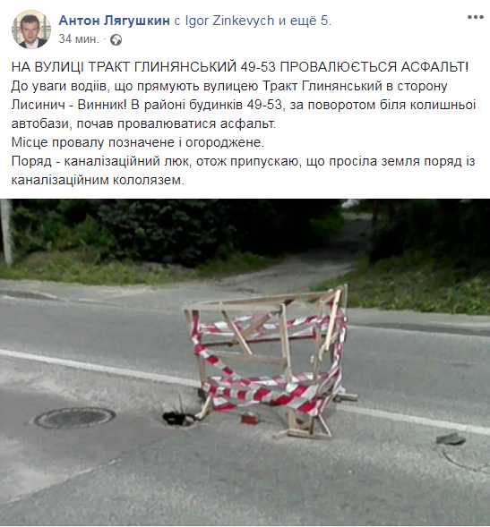 “До уваги водіів, що прямують вулицею Тракт Глинянський в сторону Лисинич – Винник! В районі будинків 49-53, за поворотом біля колишньоі автобази, почав провалюватися асфальт. Місце провалу позначене і огороджене. Поряд – каналізаційний люк, отож припускаю, що просіла земля поряд із каналізаційним кололязем”, – зазначається у коментарі під світлинами.