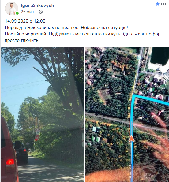 “14.09.2020 о 12:00. Переїзд в Брюховичах не працює. Небезпечна ситуація! Постійно червоний. Підїджають місцеві авто і кажуть: їдьте – світлофор просто глючить”, – зазначається у дописі.