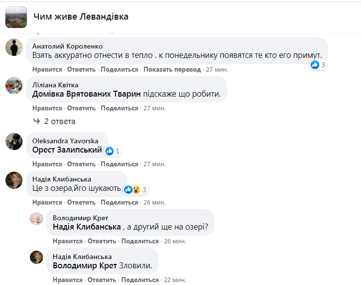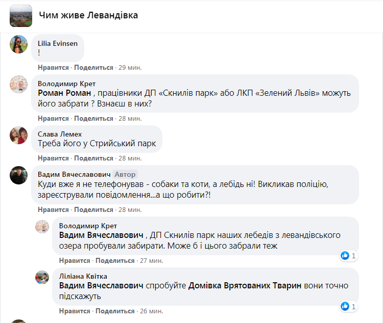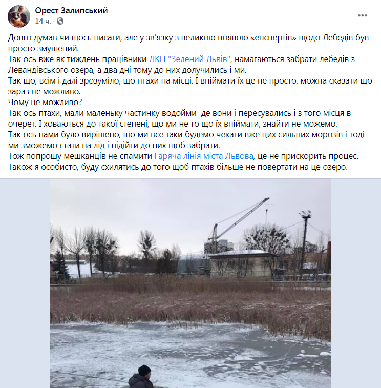 «Довго думав чи щось писати, але у зв’язку з великою появою «епспертів» щодо Лебедів був просто змушений. Так ось вже як тиждень працівники ЛКП “Зелений Львів”, намагаються забрати лебедів з Левандівського озера, а два дні тому до них долучились і ми. Так що, всім і далі зрозуміло, що птахи на місці. І впіймати їх це не просто, можна сказати що зараз не можливо. Чому не можливо? Так ось птахи, мали маленьку частинку водойми де вони і пересувались і з того місця в очерет. І ховаються до такої степені, що ми не то що їх впіймати, знайти не можемо. Так ось нами було вирішено, що ми все таки будемо чекати вже цих сильних морозів і тоді ми зможемо стати на лід і підійти до них щоб забрати. Тож попрошу мешканців не спамити Гарячу лінію міста Львова, це не прискорить процес. Також я особисто, буду схилятись до того щоб птахів більше не повертати на це озеро”, – написав на своїй сторінці у ФБ голова правління Еко Zахист Орест Залипський.