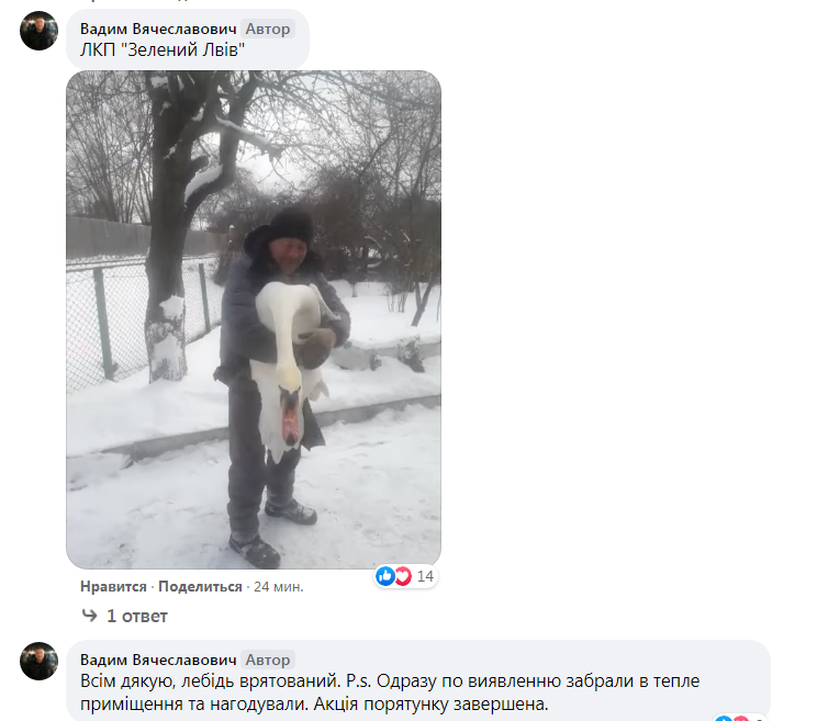 Як згодом повідомили у коментарях до допису, лебедя врятували, “забрали в тепле приміщення та нагодували”.