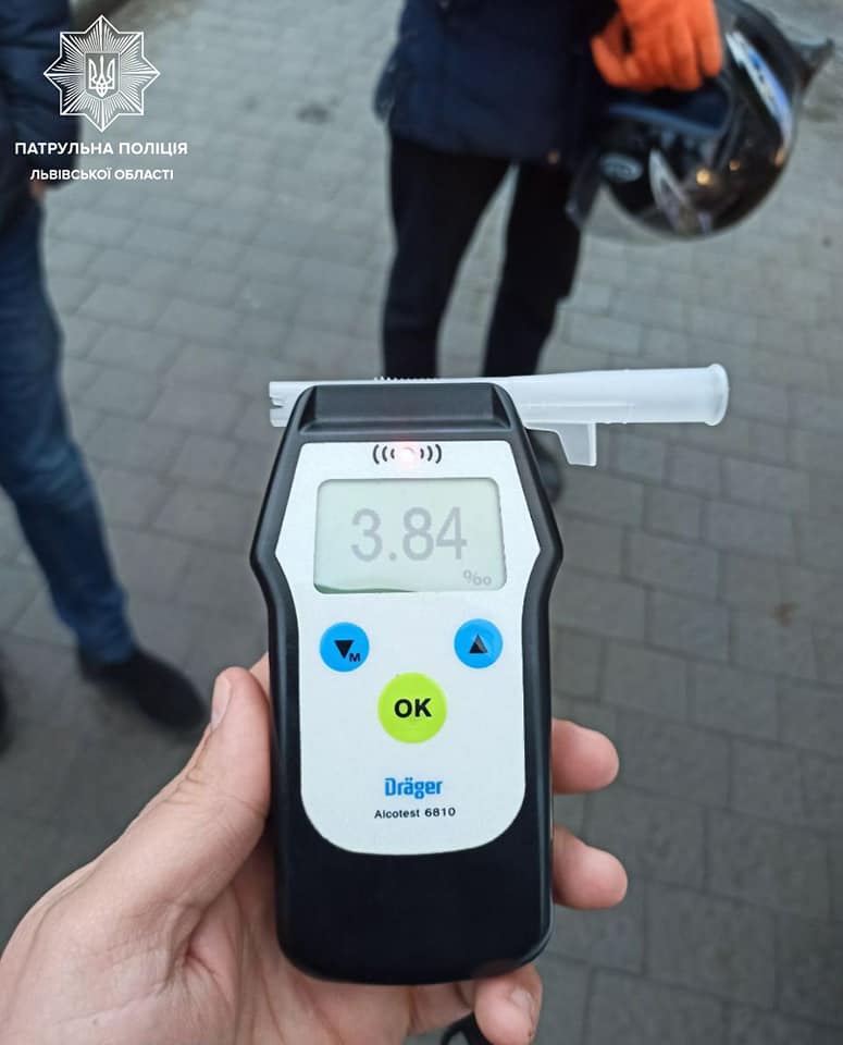 На місці події керманич авто відмовився від оформлення ДТП, адже поспішав на роботу. Патрульні все ж вирішили поспілкуватися з водієм скутера. У інспекторів одразу виникла підозра, що 31-річний чоловік нетверезий. Прилад Drager це підтвердив. Результат вразив — 3,84 проміле.