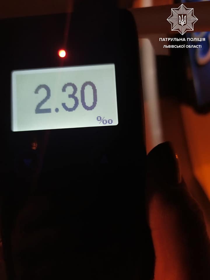 У 45-річного львів’янина виявили ознаки алкосп’яніння. В присутності двох свідків він пройшов перевірку на пристрої Drager — результат 2,30 проміле.