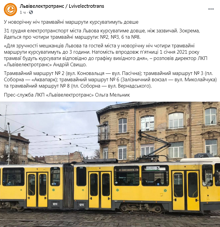 «Для зручності мешканців Львова та гостей міста у новорічну ніч чотири трамвайні маршрути курсуватимуть до 3 години. Натомість впродовж п’ятниці 1 січня 2021 року трамваї будуть курсувати відповідно до графіку вихідного дня», – розповів директор ЛКП «Львівелектротранс» Андрій Свищо.