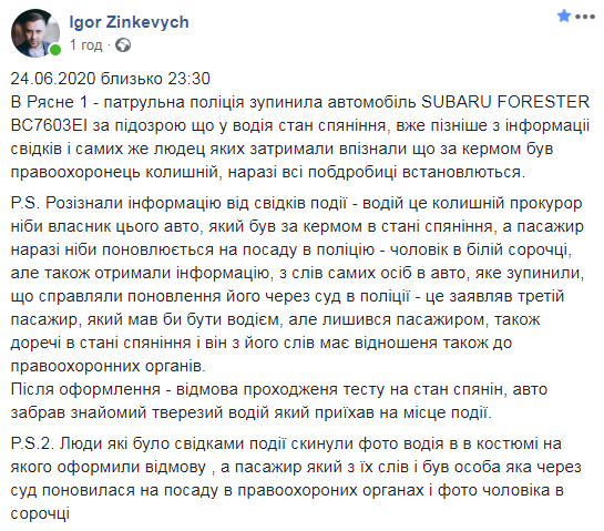 “24.06.2020 близько 23:30, в Рясне 1 – патрульна поліція зупинила автомобіль SUBARU FORESTER ВС7603ЕІ за підозрою що у водія стан сп’яніння, вже пізніше з інформації свідків і самих же людей яких затримали впізнали, що за кермом був правоохоронець колишній, наразі всі подробиці встановлюються.