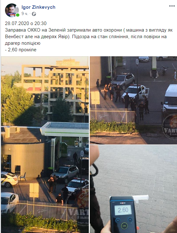 28.07.2020 о 20:30, заправка ОККО на Зеленiй затримали авто охорони (машина з вигляду, як “Венбест” але на дверях “Явір“). Пiдозра на стан сп’янiння, після повірки на драгер поліцією – 2,60 проміле”,- повідомив депутат.