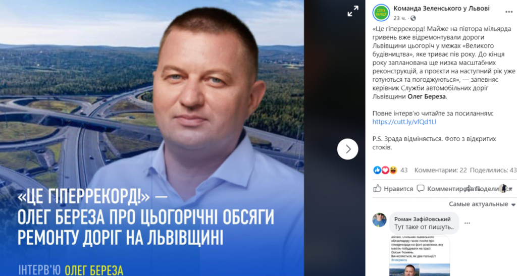 Відповідне інтерв’ю поширили 7 вересня на сторінці «Команди Зеленського у Львові» у Facebook. На використання російського фото звернули увагу користувачі. Після цього адміністратор «Команди Зеленського у Львові» заявив, що ілюстрацію взяли зі стокового сайту, запевняючи, що насправді такої розв’язки нема ні в Росії, ні в Україні: «Не потрібно шукати зради на заборонених сайтах. Такої дороги там немає. І поки що немає у нас».