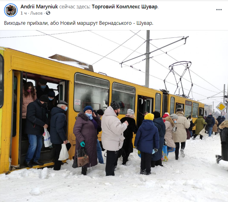 «Виходьте приїхали, або Новий маршрут Вернадського – Шувар», – зазначив на своїй сторінці у ФБ Andrii Maryniuk, який оприлюднив світлину з місця «вимушеної» зупинки і висадки пасажирів трамваю у Львові.