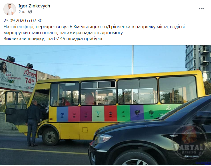 «23.09.2020 о 07:30. На світлофорі, перехрестя вул. Б.Хмельницького-Грінченка в напрямку міста, водієві маршрутки стало погано, пасажири надають допомогу. Викликали швидку, на 07:45 швидка прибула»,- повідомив депутат Зінкевич.