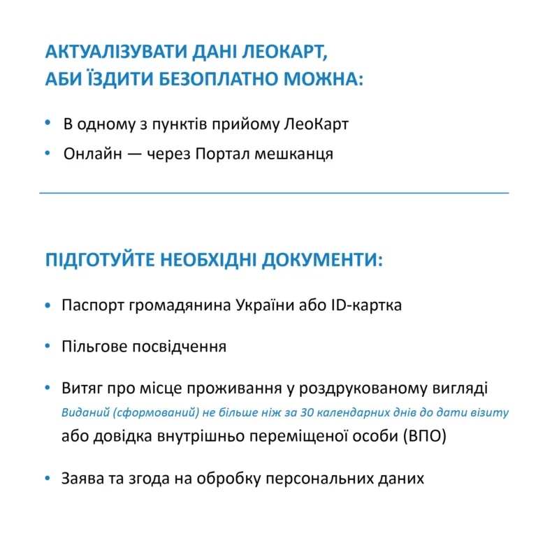 Необхідно надати актуальні документи для оновлення даних у профілі вашої транспортної ЛеоКарт (перелік необхідних документів вказано у каруселі зображень):