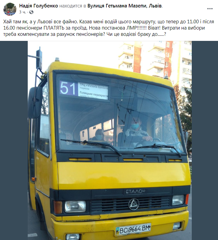 Як зазначається у дописі Надії Голубенко у ФБ, водій маршрутного таксі №51 заявив, що «пенсіонери тепер до 11.00 і після 16.00 пенсіонери платять за проїзд».