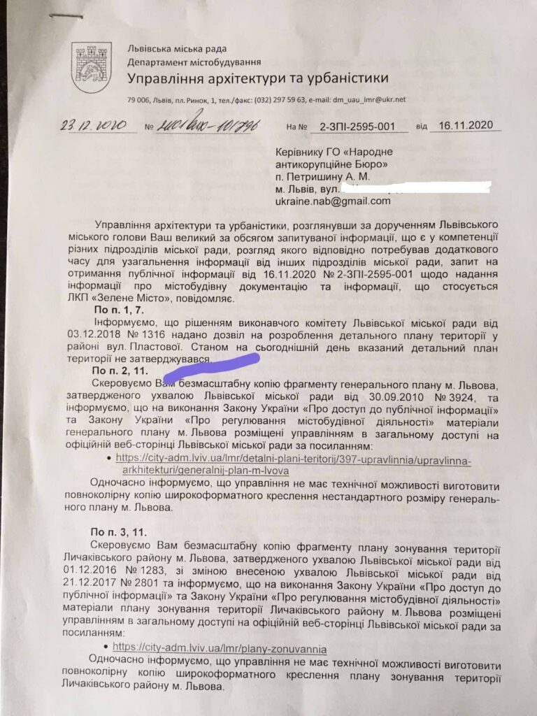 Отже, львів’яни-платники податків не мають жодної змоги здійснювати ефективний контроль за використанням бюджетних коштів. Бо виходить так, що від громадськості по суті засекретили об’єкт, який має важливе стратегічне значення та значні екологічні ризики. Звичайно, що така ситуація обурює народ. Люди хочуть знати правду, що ж все-таки будують на вулиці Пластовій, 13. Більше того, як виявилося, станом на сьогодні детальний план території, де має будуватися сміттєпереробний завод, ЛМР не затверджений. Це видно із відповіді управління архітектури та урбаністики ЛМР на запит Андрія Петришина.