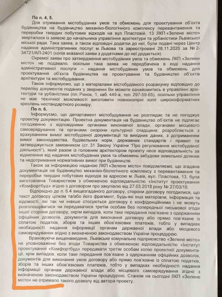 Про це управління архітектури та урбаністики ЛМР повідомило у відповіді на запит керівнику ГО «Народне антикорупційне бюро» Андрію Петришину. Документація на будівництво МБК ПП ТПВ, або, як в народі кажуть, сміттєпереробний завод, була виготовлена ТОВ «Інститут проектування «Комфортбуд» згідно з договором про закупівлю від 27 березня 2018 року № 27/03/18. Замовником проєкту будівництва є Львівське комунальне підприємство «Зелений Львів».