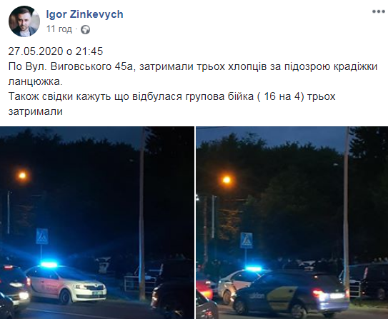 Як пише «Четверта студія», депутат Львівської міської ради Ігор Зінкевич повідомив на своїй сторінці у ФБ про те, що «27 травня о 21:45, по вул. Виговського, 45а, затримали трьох хлопців за підозрою крадіжки ланцюжка. Також свідки кажуть, що відбулася групова бійка (16 на 4), трьох затримали».