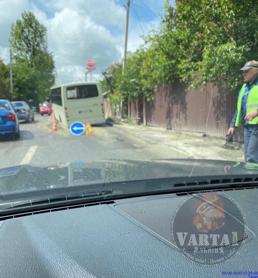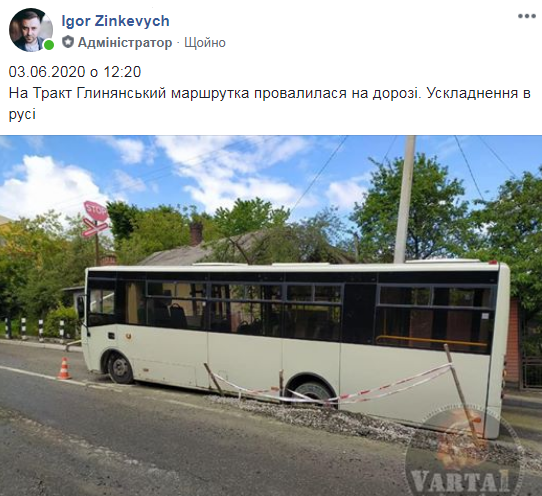 “03.06.2020 о 12:20, на Тракт Глинянський маршрутка провалилася на дорозі. Ускладнення в русі”, – повідомив Зінкевич, який оприлюднив світлини з місця події.