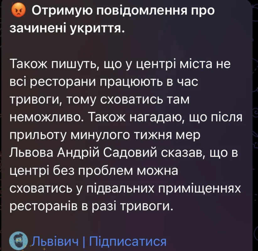 “Андрій Садовий — може поясните, якого чорта ви відправляєте людей замість в укриття, які мали б вже давно бути у Львові упорядковані/збудовані на 5-му році війни, до ресторанів і підвалів??? Іх ще треба знайти!! Люди в місті під час тривоги мають бігати шукати укриття в кавʼярнях?