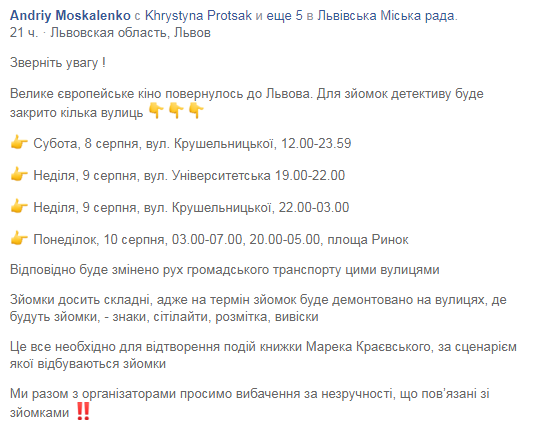 Позначки: вихідні, зйомки фільму, Львів, схема, транспорт