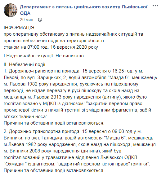 Як пише «Четверта студія», у департаменті цивільного захисту Львівської ОДА повідомили, що 15 вересня о 16:25 год. у м. Львові, по вул. Зарицьких, 2, водій автомобіля “Мазда 6”, мешканець м. Львова 1982 року народження, рухаючись на пішохідному переході, не надав перевагу в русі пішоходу та скоїв наїзд на 7-річного мешканця м. Львова, якого було госпіталізовано у МДКЛ із діагнозом: “закритий перелом правої променевої кістки в нижній третині зі зміщенням фрагментів, забій м’яких тканин носа”.