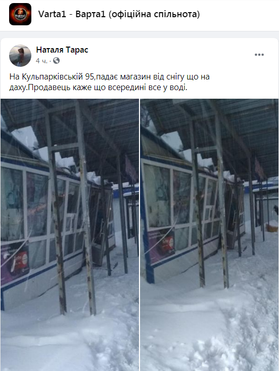 «На Кульпарківській, 95, падає магазин від снігу, що на даху. Продавець каже, що всередині все у воді», – зазначає у коментарі до світлин Наталя Тарас.