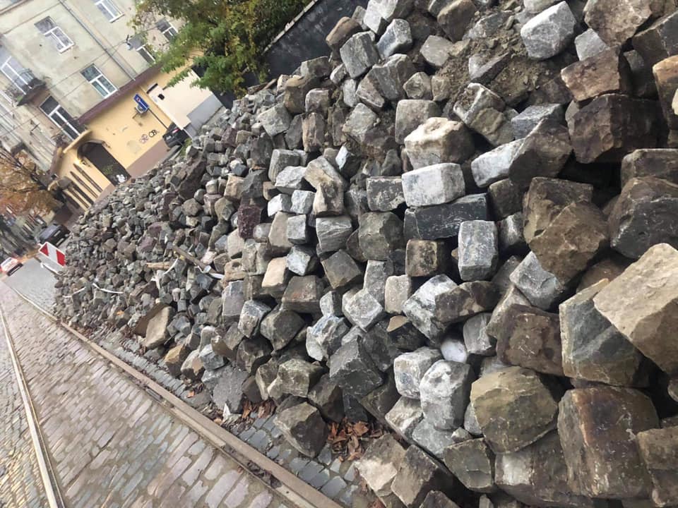 «Вулицю Шевченка розібрано від церкви Анни до вул Ярослава Мудрого, бруківку чорну базальтову, якою 100% була забрукована вулиця Шевченка вивезено (викрадено) на міфічні склади. Після пікетів на вул. Степана Бандери і, як наслідок депутатське звернення Синютки, щодо зникнення бруківки на вул. Шевченка повертають бруківку і вивантажують насипом трішки вище. Але що повертають? Ось тут головне ! Повертають не чорну базальтову (найдорожчу в Європі), а сіру гранітну в кілька разів дешевшу!»,- зазначається у дописі.