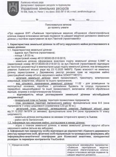 “Надати КНП “Львівське ТМО “Багатопрофільна клінічна лікарня інтенсивних методів лікування та швидкої медичної допомоги” земельну ділянку площею 1,8133 га на вул. Північній (проєктованій) у постійне користування для будівництва та обслуговування будівель і споруд фармацевтичного виробництва з метою забезпечення пацієнтів фармацевтичними препаратами та надання безперервних якісних медичних послуг за рахунок земель промисловості, транспорту, електронних комунікацій, енергетики, оборони та іншого призначення” – йдеться в ухвалі.