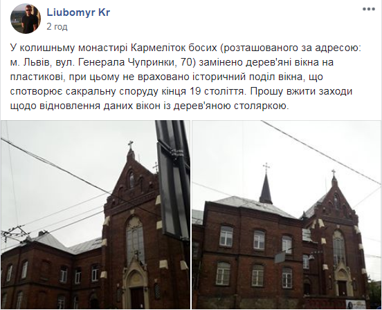 «У колишньму монастирі Кармеліток босих (розташованого за адресою: м. Львів, вул. Генерала Чупринки, 70) замінено дерев’яні вікна на пластикові, при цьому не враховано історичний поділ вікна, що спотворює сакральну споруду кінця 19 століття. Прошу вжити заходи щодо відновлення даних вікон із дерев’яною столяркою», – зазначається у зверненні на «Гарячу лінію міста Львова» Liubomyr Kr, який оприлюднив світлини з місця події.