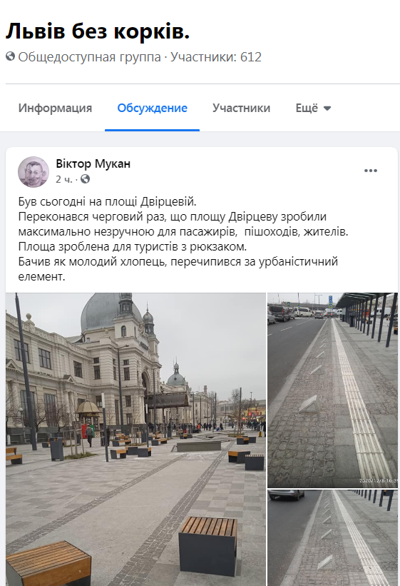 «Був на площі Двірцевій. Переконався черговий раз, що площу Двірцеву зробили максимально незручною для пасажирів, пішоходів, жителів. Площа зроблена для туристів з рюкзаком. Бачив як молодий хлопець, перечепився за урбаністичний елемент», – зазначив у дописі на сторінці спільноти «Львів без корків» Віктор Мукан, який оприлюднив світлини з площі Двірцевої після проведеного ремонту.