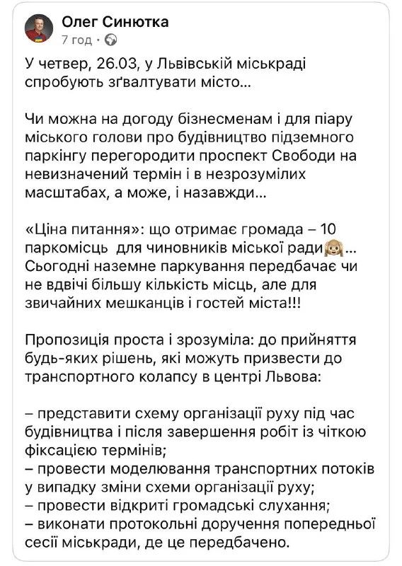“Чи можна на догоду бізнесменам і для піару міського голови про будівництво підземного паркінгу перегородити проспект Свободи на невизначений термін і в незрозумілих масштабах, а може, і назавжди…