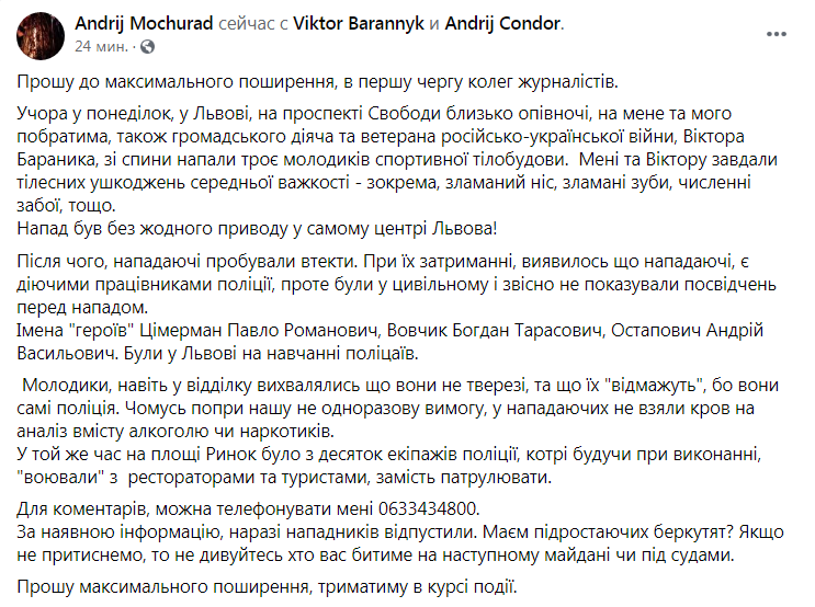 «Учора у понеділок, у Львові, на проспекті Свободи близько опівночі, на мене та мого побратима, також громадського діяча та ветерана російсько-української війни, Віктора Бараника, зі спини напали троє молодиків спортивної тілобудови. Мені та Віктору завдали тілесних ушкоджень середньої важкості – зокрема, зламаний ніс, зламані зуби, численні забої, тощо. Напад був без жодного приводу у самому центрі Львова!