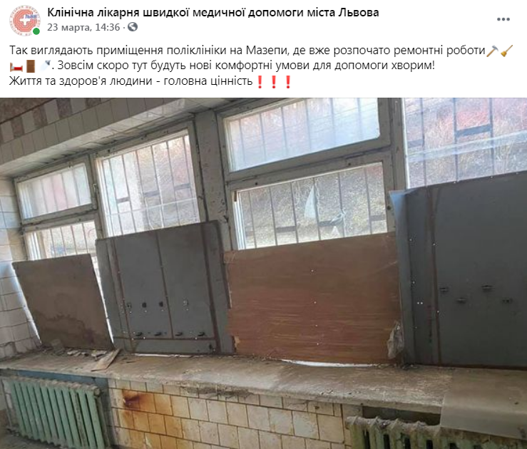 «Так виглядають приміщення поліклініки на Мазепи, де вже розпочато ремонтні роботи. Зовсім скоро тут будуть нові комфортні умови для допомоги хворим! Життя та здоров’я людини – головна цінність», – зазначається у коментарі до світлин, які оприлюднено на сторінці Клінічної лікарні швидкої медичної допомоги міста Львова.