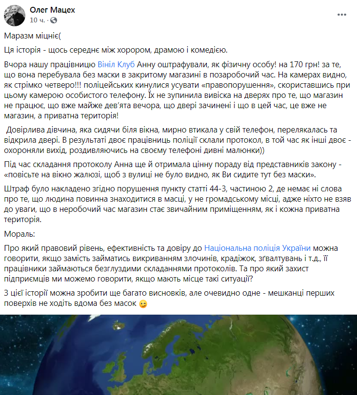«Маразм міцніє. Ця історія – щось середнє між хорором, драмою і комедією. Вчора нашу працівницю Вініл Клуб Анну оштрафували, як фізичну особу! на 170 грн! за те, що вона перебувала без маски в закритому магазині в позаробочий час. На камерах видно, як стрімко четверо!!! поліцейських кинулися усувати «правопорушення», скориставшись при цьому камерою особистого телефону. Їх не зупинила вивіска на дверях про те, що магазин не працює, що вже майже дев’ята вечора, що двері зачинені і що в цей час, це вже не магазин, а приватна територія!