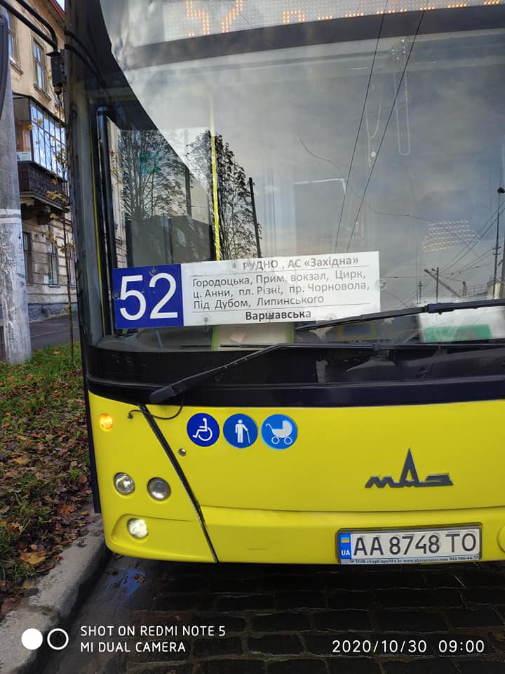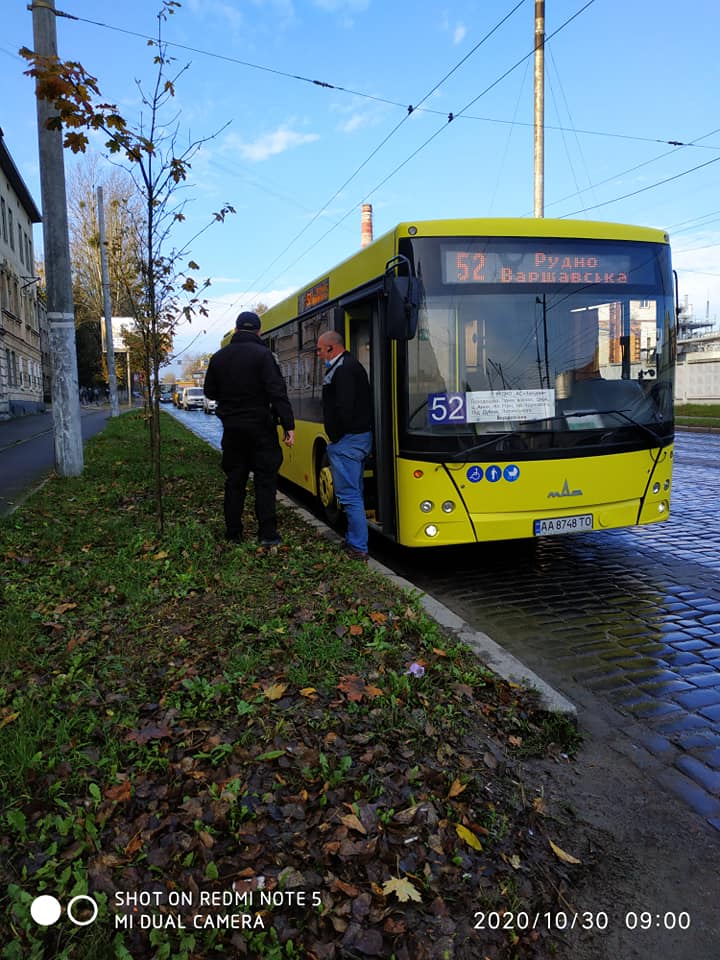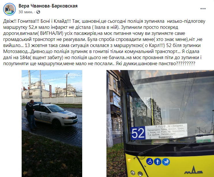 «Сьогодні поліція зупиняла низькопідлогову маршрутку №52. Зупинили просто посеред дороги, вигнали усіх пасажирів. На моє питання чому ви зупиняєте саме громадський транспорт не реагували. Була спроба спровадити мене. Хто знає мене, ніт, не вийшло…