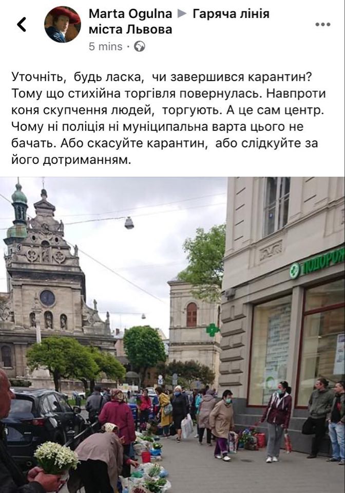 “Стихійна торгівля повернулась. Навпроти коня скупчення людей, торгують. А це сам центр. Чому ні поліція, ні муніципальна варта цього не бачать. Або скасуйте карантин, або слідкуйте за його дотриманням”, – йдеться у дописі.