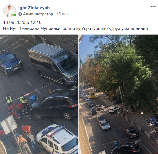 “16.09.2020 о 12:10. На вул. Генерала Чупринки, збили кур‘єра Domino’s, рух ускладнений”, – повідомив Ігор Зінкевич на сторінці ГО “Варта 1”, де оприлюднено світлини з місця події.