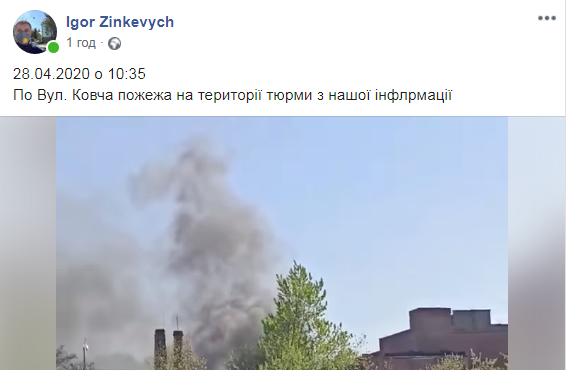 “28.04.2020 о 10:35. По Вул. Ковча пожежа на території тюрми з нашої інформації”, – повідомив Зінкевич, який виклав відео з місця події.