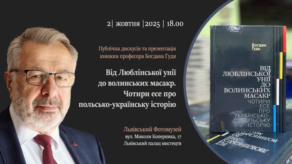 У четвер, 2 жовтня 2025 року о 18.00, у Львівському Фотомузеї (Львівський палац мистецтв, вул. Коперника, 17) відбудуться публічна дискусія та презентація книжки професора Богдана Гудя «Від Люблінської унії до волинських масакр. Чотири есе про польсько-українську історію».