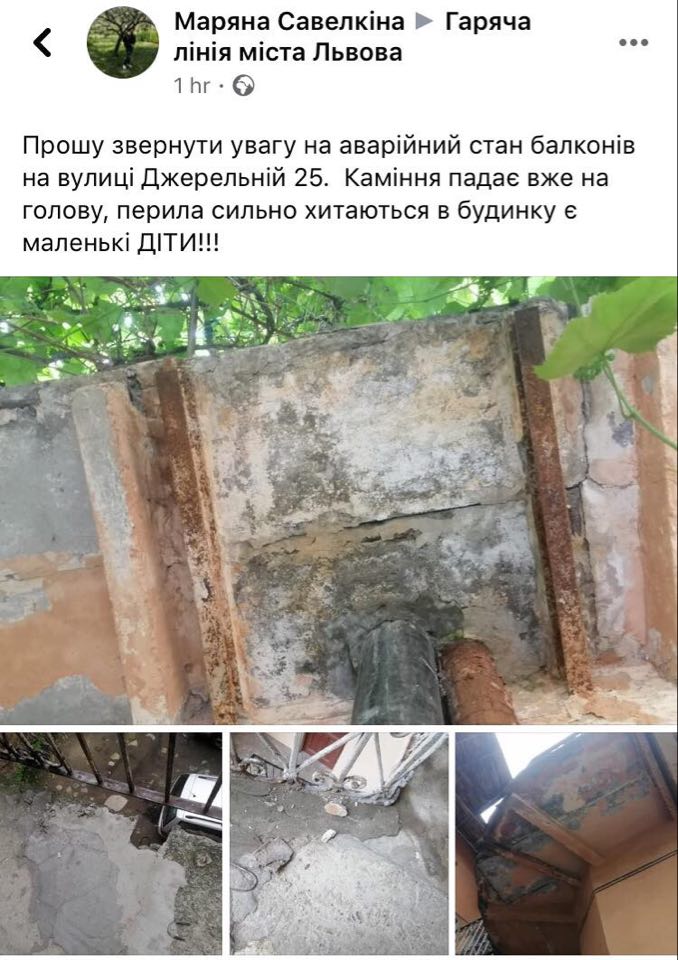 “Каміння падає вже на голову, перила сильно хитаються в будинку є маленькі діти”, – йдеться у дописі.