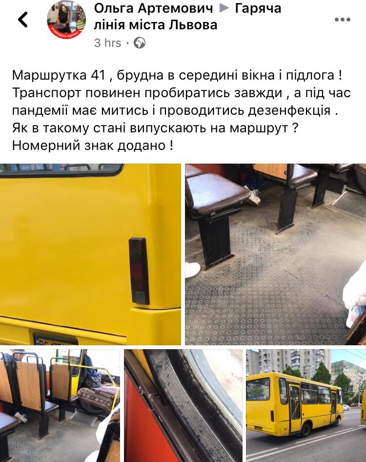 “Маршрутка № 41, брудні всередині вікна і підлога. Транспорт повинен пробиратись завжди, а під час пандемії має митись і проводитись дезінфекція. Як в такому стані випускають на маршрут?”, – йдеться у дописі.