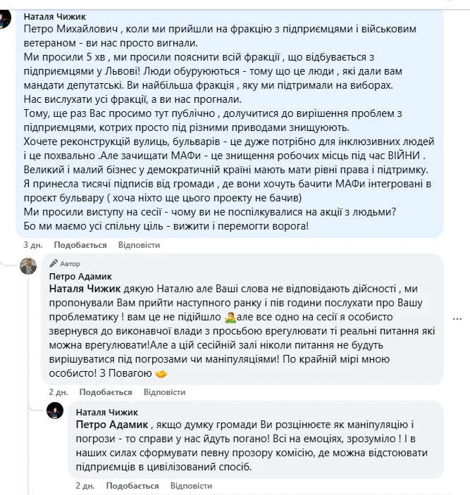 “Якщо думку громади Ви розцінюєте як маніпуляцію і погрози – то справи у нас йдуть погано! Всі на емоціях, зрозуміло ! І в наших силах сформувати певну прозору комісію, де можна відстоювати підприємців в цивілізований спосіб”, – відписала Наталя Чижик.