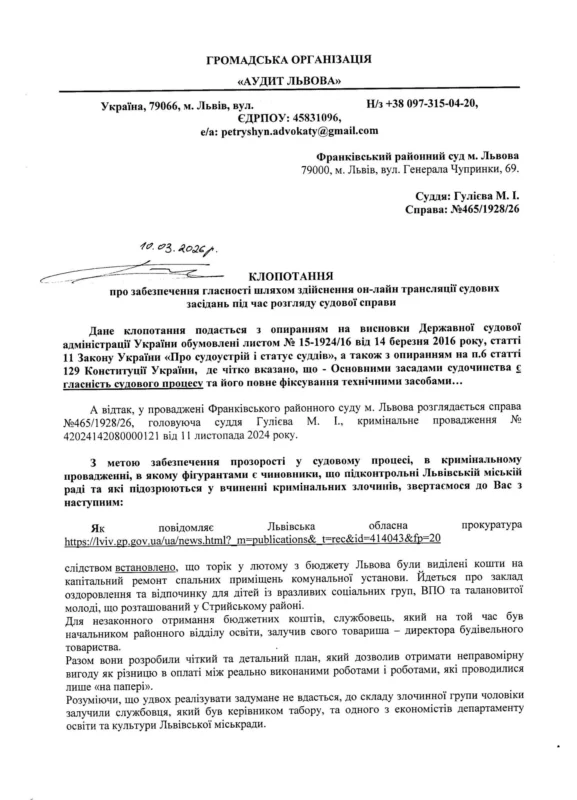 Тож з урахуванням того, що предметом справи, що розглядається в суді є зловживання чиновників з бюджетними (суспільними) коштами, і виявлені злочини стосуються періоду, що припав на воєнний час, то 24 березня 2026 року, о 11год. 30хв., Франківский районний суд м. Львова розглянувши клопотання «ГО «Аудит Львова», має задовольнити його, і суд буде висвітлювати весь судовий процес в режимі реального часу.
