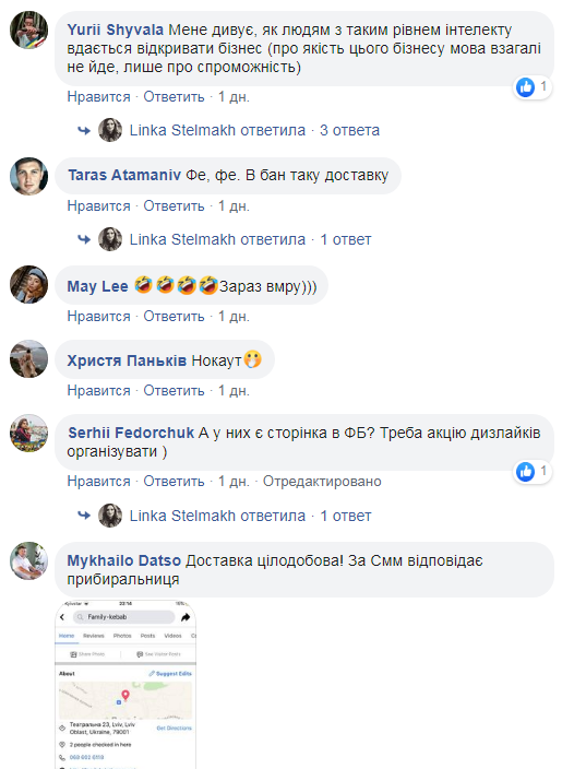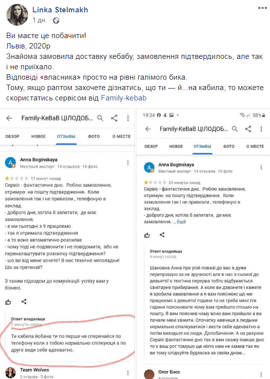 “Львів, 2020 року. Знайома замовила доставку кебабу, замовлення підтвердилось, але так і не приїхало. Відповіді «власника» просто на рівні галімого бика. Тому, якщо раптом захочете дізнатись, що ти — й…на кабила, то можете скористатись сервісом від “Family-kebab”, – зазначається у дописі.
