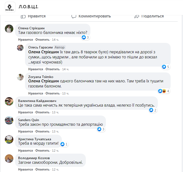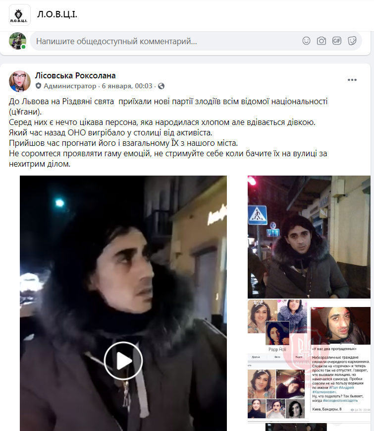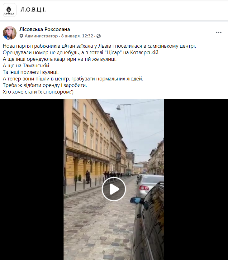 «Нова партія грабіжників циган заїхала у Львів і поселилася в самісінькому центрі. Орендували номер в готелі “Цісар” на Котлярській. А ще інші орендують квартири на тій же вулиці. А ще на Таманській. Та інші прилеглі вулиці. А тепер вони пішли в центр, грабувати нормальних людей. Треба ж відбити оренду і заробити. Хто хоче стати їх спонсором?»,- зазначається у дописі на сторінці «Л.О.В.Ц.І.» Роксолани Лісовської.