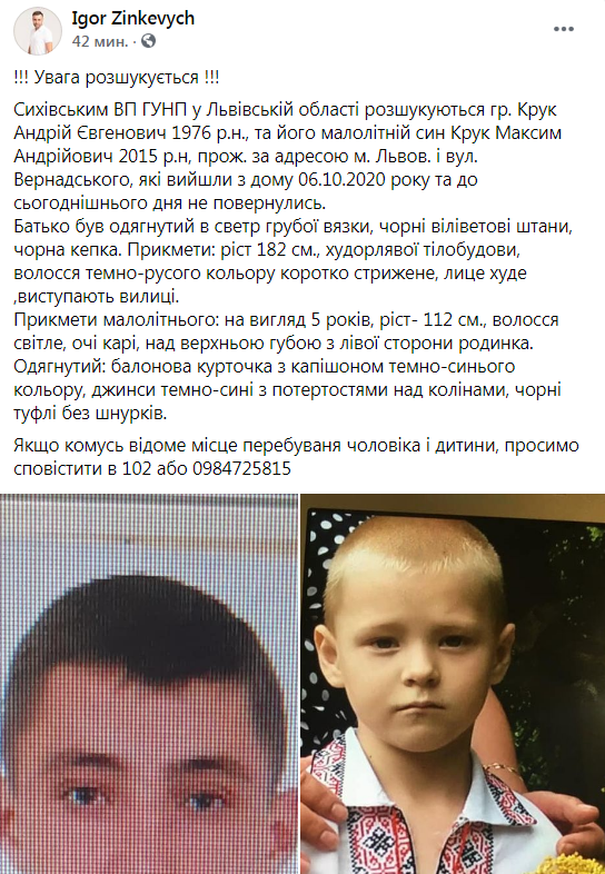 Сихівським ВП ГУНП у Львівській області розшукуються гр. Крук Андрій Євгенович 1976 р.н., та його малолітній син Крук Максим Андрійович 2015 р.н, прож. за адресою м. Львов. і вул. Вернадського, які вийшли з дому 06.10.2020 року та до сьогоднішнього дня не повернулись.