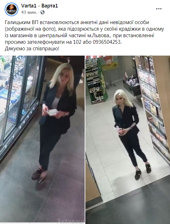 «Галицьким ВП встановлюються анкетні дані невідомої особи (зображеної на фото), яка підозрюється у скоєні крадіжки в одному із магазинів в центральній частині м.Львова. При встановленні просимо зателефонувати на 102 або 0936504253»,- повідомляє «Варта 1» у ФБ.