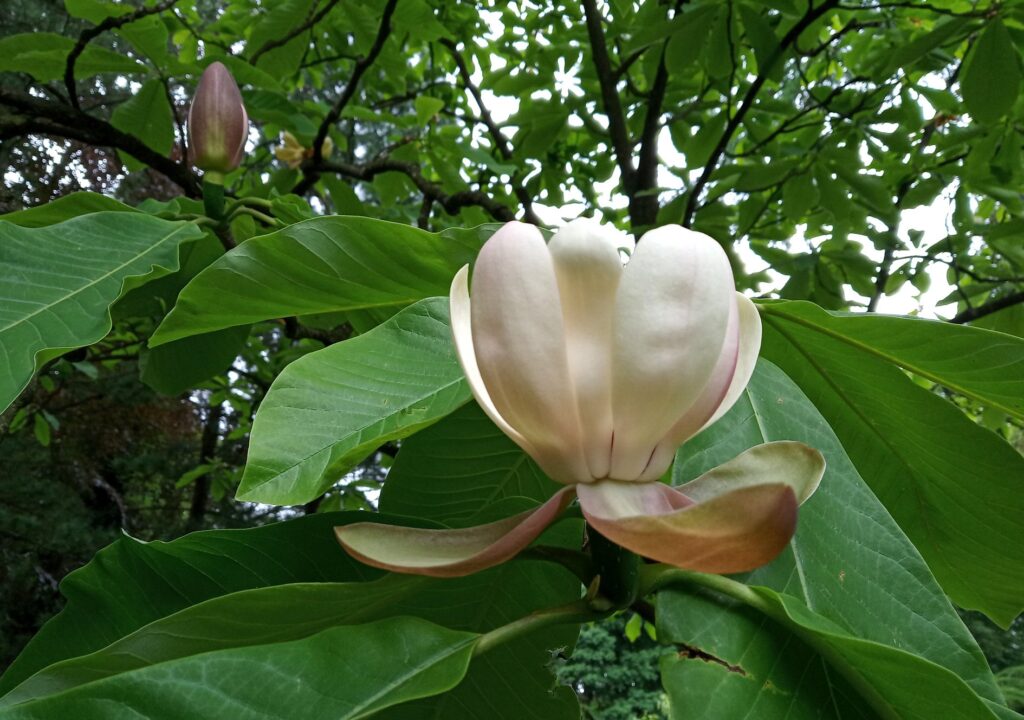 Як зазначається, рослина має назву магнолія оберненояйцеподібна. Так, саме магнолія! Однак, на відміну від своїх «родичів», рослини цього виду цвітуть значно пізніше, – в другій половині травня–на початку червня, уже після розпускання великих оберненояйцеподібних листків. Завдяки своїм білуватим квіткам, рослина відома також під назвою магнолія білоцвіта.