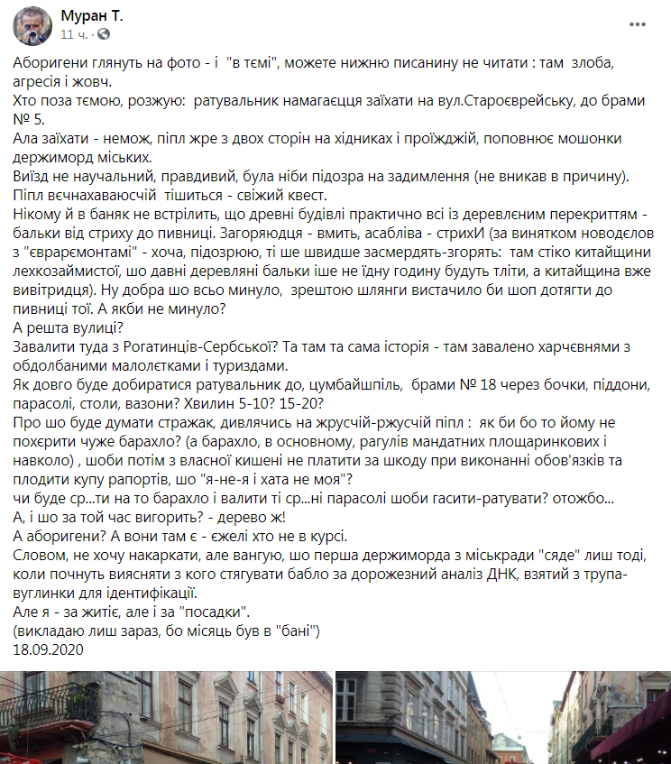 Він зазначає, що нікому в голову не приходить, що історичні будівлі у центрі Львова практично всі з дерев’яним перекриттям і можуть згоріти миттєво…