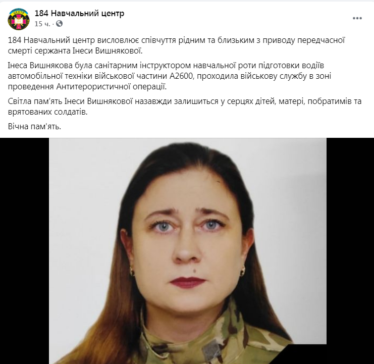 «Інеса Вишнякова була санітарним інструктором навчальної роти підготовки водіїв автомобільної техніки військової частини А2600, проходила військову службу в зоні проведення АТО. Висловлюємо щирі співчуття рідним і близьким. Вічна пам‘ять…», – зазначається у повідомленні.