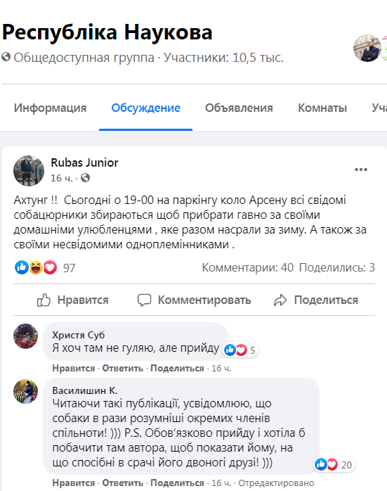 «Сьогодні о 19-00 на паркінгу коло «Арсену» всі свідомі собацюрники збираються, щоб прибрати гавно за своїми домашніми улюбленцями, яке разом насрали за зиму. А також за своїми несвідомими одноплемінниками», – зазначається у повідомленні.